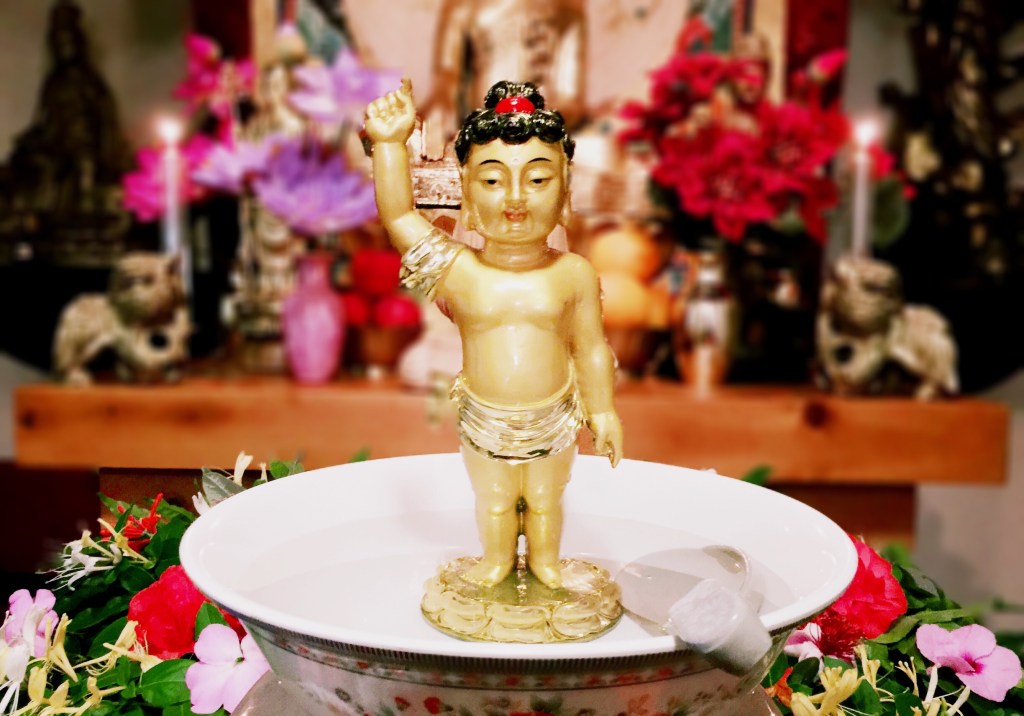 “The birth of Shakyamuni brought the sun to a world of darkness and illuminated the whole universe. He took upon Himself the form of a human being, was born with the thirty-two marks of a buddha, and for immeasurable time pursued works of great compassion. He found and transcended the cause of suffering; all beings, whether saints or ordinary beings, praise this magnificent understanding. His three hundred sermons are for us as rain is for trees and grass. Just as rain causes drooping flowers to flourish, so His words touch our heavy hearts. At this very moment the Rain of the Dharma pours into the lake of Kindness. The merit of His life may be likened to the wind which, as it bends the grass and fans the leaves, blows the good seed of the Dharma to take root in the hearts of people all over the world even after more than twenty-five hundred years, and will continue to do so not only in this world but also in the next. We, the followers of our Great Master Shakyamuni, bow in gratitude to Him for his goodness and compassion as we celebrate His Birthday. We pray that His halo, which is the Light of the Dharma, will illuminate the darkness of the delusion of those beings of this world who have not yet heard His Name. We pray that all beings may be saved and thus prosper for all eternity. We pray that the Seed of Buddhahood will bud and blossom into the Flower of Enlightenment so that its beauty may fill the universe.”